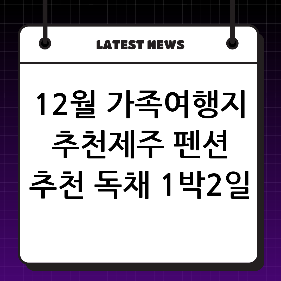12월 가족여행지 추천 제주 펜션 추천 독채 1박2일 추천으로 제주도는 단연 최고의 선택지입니다. 올겨울 사랑하는 가족과 제주에서 잊지 못할 추억을 만들어보는 것은 어떨까요? 이 글을 끝까지 읽으면 완벽한 제주도 1박 2일 독채 펜션 여행 계획을 쉽게 세울 수 있습니다.